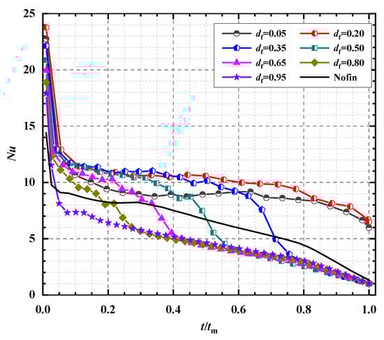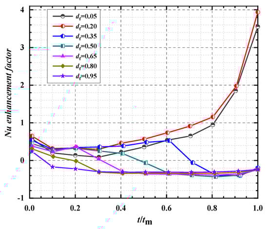 where Nu (df) is the Nu with the fin location, df. Nu (no fin) is taken from the no fin case for a reference value. The variation of εNu with t/tm for different df is shown in Figure 9 and the analyses are as follows: