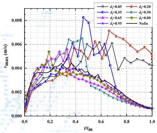 - εNu increases with t/tm in the whole melting process for df = 0.05 and 0.20. It is expected since mounting fin at a lower position enhances conduction at the beginning and facilitates natural convection at the middle and late stages; besides, the melting in the left corner is reinforced by the lower fin significantly, which is extensively regarded as a factor prolonging melting process seriously [28,46]. A testimony that facilitates natural convection is provided by Figure 10 which shows the variation of the maximum liquid flow velocity, vmax, with t/tm. For t/tm > 0.30, the difference between vmax (df) and vmax (no fin) enlarges notably with t/tm, precisely corresponding to the sharp increase of εNu.