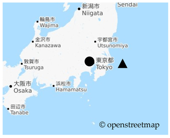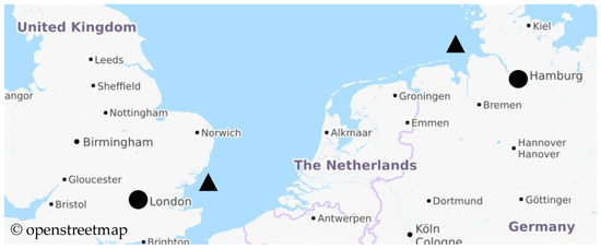 Figure 1 and Figure 2 show the facility’s location in JP and the assumed locations of the facility for GER and the UK (symbol: circle). The characteristics of the facility’s locations are similar across all three countries (i.e., location close to a big city and similarly close to the coastline). The renewables’ generation profiles of each location are based on data from renewables.ninja [39,40,41]. For both photovoltaic (PV) and wind generation profiles, the MERRA-2 (global) dataset (year of data: 2019) was used. For the PV generation profiles, a tilt of 35° and south-facing (azimuth: 180°) was assumed. For realistic wind energy generation profiles, renewables.ninja allows its users to define specific wind turbine types. For the onshore wind generation profile, a Vestas V136 4000 turbine, Vestas Wind Systems A/S, Aarhus, Denmark (hub height: 114 m) was assumed. For the offshore wind generation profile, a Vestas V164 9500 turbine, Vestas Wind Systems A/S, Aarhus, Denmark (hub height: 110 m) was chosen. The assumed locations of potential offshore wind turbines are displayed in Figure 1 and Figure 2 (symbol: triangle).