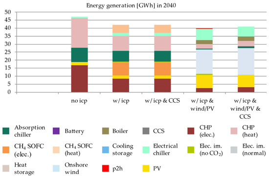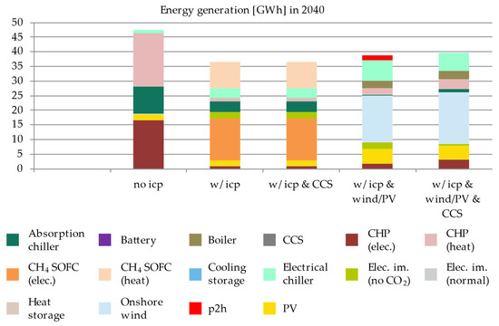 Incorporating the ICP (Table 2) into the German scenario environment induces changes in the energy system. Besides the boiler (321 kW), the electrical chiller (1517 kW), and an absorption chiller installation, a CH4-fuel cell (1740 kW) is installed in 2040 (see bar 3 in Figure 3).