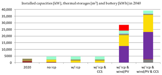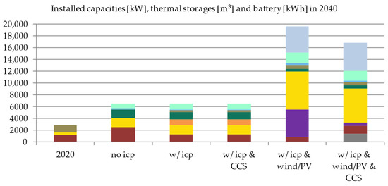 Bar 6 of Figure 3 shows the installed capacities for the “w/ICP and PV/wind and CCS” scenario. The CCS technology is installed (1699 kW) while the p2h and the battery storage capacities are, compared to the “w/ICP and PV/wind” scenario, not expanded at all (p2h) or not as much (battery storage).