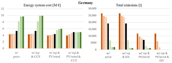 With the CCS technology and the unlimited renewable energy potential, the energy generation changes (see bar 5 in Figure 4). The use of CHP and boiler increases compared to the “w/ICP and PV/wind” scenario. It is cheaper to use the CHP and boiler, fueled by gas, and compensate the associated emissions with CCS than to focus on integrating renewable energies via energy storage and sector integration technologies. Therefore, the energy storage and sector integration technologies do not play the same role as in the previous scenario and are used considerably less. The energy system cost is 4.91 M €. Since the model is optimised using the ICP and has the highest degree of freedom towards reducing the emissions, they are the lowest of all the German scenarios, reaching complete decarbonisation and hence zero emissions (see also Figure A5). Therefore, there are no additional carbon emission costs.