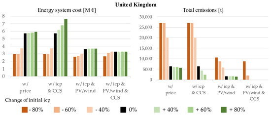 Analysing only the energy system cost increase (without accounting for external carbon prices) across the scenarios shows a price increase between 3.1% (comparing the “no ICP” to the “w/ICP and PV/wind” scenario) and 24.5% (comparing the “no ICP” to the “w/ICP and CCS” scenario). This comparison is later used to compare the impact of ICP across different countries. Overall, the results show that for both the energy and the total system cost, an increase in renewable energy capacities leads to a cost reduction.