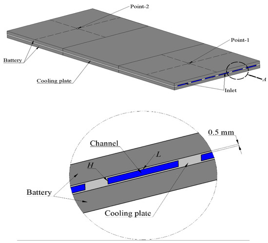 The thermal management strategy of the battery module consisting of six commercial rectangular lithium-ion battery cells is studied in this work. It is assumed that the battery acts as a uniform heat source in the study. The BTMS for this module is characterized by the liquid cooling approach with a mini-channel cooling plate. As shown in Figure 1, the six cells are arranged in two rows (each row with three cells aligned in parallel), separated by the cooling plate. The cooling plate is adhered to the largest side of the cell, which has the advantage of forming a large heat exchange area. Temperature monitoring points (Point-1 and Point-2 used in Section 3) are located in the center of the battery surface, as shown in Figure 1. The size of the single cell is 207 × 157 × 7 mm, while the size of the cooling plate is 471 × 207 × (H + 1) mm, where H is the height of the rectangular channel, as shown in the cross-sectional view shown in Figure 1.