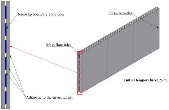 In order to solve the governing equation above, as shown in Figure 2, the initial and boundary conditions are applied as follows: the initial temperature of all computational zones was set to 25 °C. The inlet boundary condition for the cooling plate was the mass flow rate with a constant temperature, while the outlet one was the pressure outlet. In the orthogonal test below, the specific inlet mass flow rate will be given. The inner wall of the cooling plate was fixed by a non-slip boundary condition. The battery module is modelled to be thermally insulated from the external environment, i.e., the heat generated by the battery is carried away only by water, while the heat source term is implemented for the battery cells in the UDF.