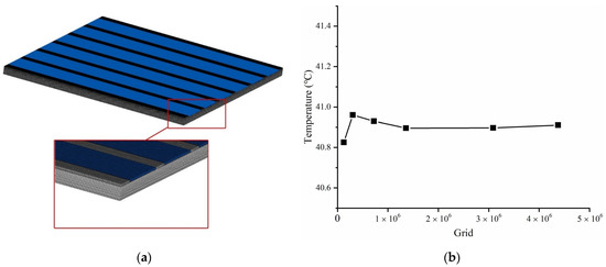 In this study, the geometric model of the battery module was established in SolidWorks and further imported into ANSYS MESHING for a mesh division. Hexahedral grids generated for the domains are highlighted in Figure 3a. It should be mentioned that the part colored with blue is for the fluid domain, while the ones with other colors are for the cooling plate and the batteries.