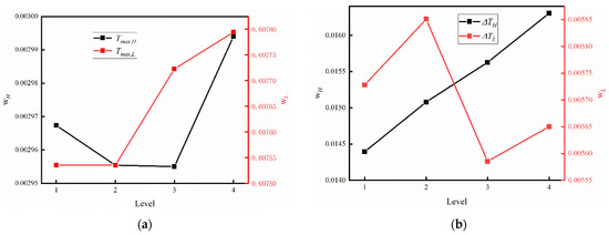 Based on the orthogonal design method presented in the above Section 2.3, the influence of the channel size on the flow and heat transfer in the channel is presented and discussed in this section. Figure 5 shows the weight of the channel height H and width L at four different levels on the maximum temperature and temperature difference. In the above Figure, the vertical axis and the horizontal axis represent the weights and four levels varied with different factors. The black and red polylines represent the influence of the channel height and channel width, respectively. It can be observed in Figure 5a that as the channel width increases, the heat dissipation capacity of the cold plate is increased due to the increase of the effective heat exchange area between water and the battery. This finding is consistent with that of Jin [34]. As the height of the channel increases, the heat transfer between water and batteries is slightly weakened at smaller H and then strengthened as H increases. This predicted result may be due to the fact that, on the one hand, increasing the height can increase the wet perimeter and reduce the water velocity when the inlet flow rate is fixed. This slightly weakens the convective heat transfer performance through the channels. On the other hand, with the increasing of the channel height, the heat transfer area between the coolant and the cooling plate gradually increases and the enhanced heat transfer effect will exceed the effect of the decreasing flow velocity. In overall, it can be seen from Figure 5a that factor L has a greater influence on the maximum temperature of the battery module than factor H.