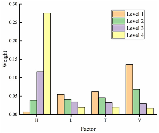It is also important to reasonably deal with the orthogonal testing results for obtaining the correct analysis and summary according to the processing results. There are two options observed in the existing analysis. The first option is a simple analytical process but complicated result. The other one is that the calculation process is complex and prone to limited errors. Therefore, the matrix analysis method [33] of the orthogonal design is adopted due to a fact that it is able to get quickly the primary and secondary order of the influencing factors through the design and calculations. The weight matrix of the design method can be obtained, which clearly reflects the significance of each individual factors from the evaluated indexes of the designs.