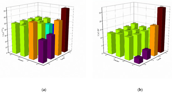 The weight matrix analysis method is used to optimize the selection of the multi-objective orthogonal design schemes. According to the orthogonal design scheme, a three-layer structure model needs to be established, which are the inspection index layer, the factor layer and the level layer, respectively. From the data of each layer, the corresponding matrix formula is further established. First of all, it is assumed that, for the inspection index layer, there are m factors in the orthogonal experiment, while each factor has n levels. The average value of the testing index at the j level of the i factor is specified as kij. If the value of the index is proportional to the expectation, i.e., the larger the index is, the more satisfied the expectation is. Let Kij = kij, otherwise Kij = 1/kij. The matrix is constructed as presented in Equation (12). Secondly, for the factor layer, the reciprocal of the sum of Ki1 to Kin is counted as Ni. There is . The matrix of Equation (13) is established. Then, for the establishment of the horizontal layer matrix, the range of the i factor is si, and . Equation (14) is constructed. Finally, the weight matrix of Equation (15) that affects the value of the testing index can be calculated.