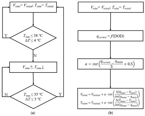 The logistics of the strategy outlined in Figure 9a is to control the battery temperature by adjusting the inlet flow rate based on the maximum temperature and temperature difference monitored in the battery module. The temperature predicted for the battery surface center is used as the regulating parameter of the thermal management strategy. This temperature is usually lower than that at the anode and cathode regions for a battery, which means that there would be a delay on the response time of BTMS, especially for the high-rate discharging process. This strategy can ensure that the battery always operates in a reasonable temperature range. In the actual working process, the temperature data monitored by the thermocouples should be transmitted to the BMS, and then the BMS gives control instructions to the cooling system. It is noteworthy that in this process the delay of the information transfer may influence the variation of the inlet velocity. Therefore, setting the proper response on the temperature change is critical for this strategy. In this logistics, the required maximum temperature and temperature difference are 38 °C and 4 °C, respectively.
