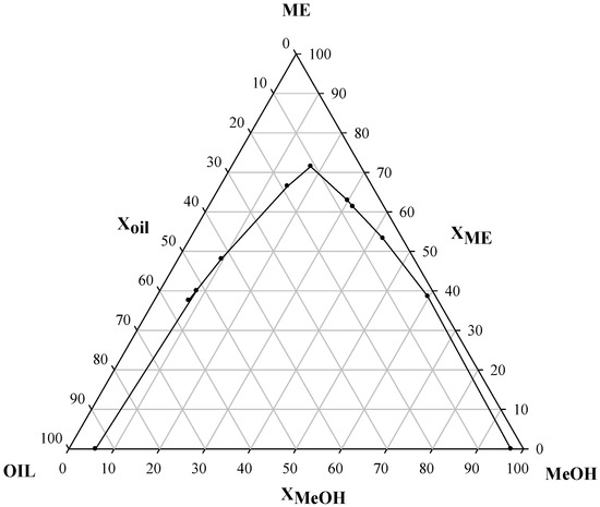 Previous studies [29,31] have focused on the behavior of GL-MeOH-ME ternary mixtures because they contain the most abundant compounds at very high oil conversions. This mixture is of interest as concerns the separation processes required to isolate and purify biodiesel. However, during the course of the reaction, it is also interesting to know the behavior of mixtures containing oil (TG). In this regard, Figure 1 shows the equilibrium diagram with the solubility curve of the ternary TG-ME-MeOH system.