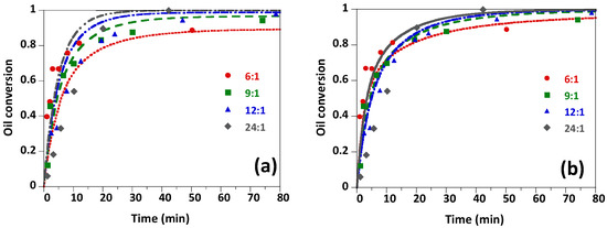 Figure 4 shows the results of the reactions carried out at 323 K, with 0.2 wt.% of NaOH and methanol/oil molar ratios of 6:1, 9:1, 12:1, and 24:1. The Figure also includes the best fittings of the pseudo-homogeneous and heterogeneous kinetic models to the experimental results. The pseudo-homogeneous model (Figure 4a) overestimates the oil conversions for the highest methanol/oil ratios. Even for the lowest methanol/oil ratio, the model does not capture the evolution of the system at short reaction times. In contrast, the heterogeneous model (Figure 4b) provides a better description of the system evolution. Particularly, the model adapts well to the range of oil conversions achieved with each methanol/oil ratio for long reaction times.