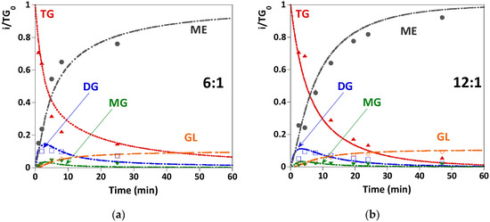 Evolution of the experimental contents (symbols) of the compounds indicated in the reaction medium referred Table 0. K with 0.2 wt.% NaOH: (a) methanol/oil ratio = 6:1; (b) methanol/oil ratio = 12:1.