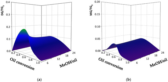 The combined effects of the methanol/oil molar ratio and the oil conversion on the evolution of the intermediate compounds contents according to the heterogeneous kinetic model are shown in Figure 6. The two maxima are clearly seen. Both become more pronounced as the methanol/oil ratio decreases, i.e., values between 9:1 and 4:1, likely due to the slowing down of the second and third methanolysis steps. The yields are almost insensitive to the methanol excess for methanol/oil ratios above 12:1.