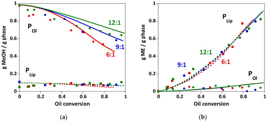 Evolution of the experimental contents (symbols) of the compounds indicated in the lipidic (PLip) and alcoholic (POl) phases and best fittings provided by the heterogeneous kinetic model (lines) for methanolysis reactions carried out at 323 K with 0.1 wt.% NaOH and the initial methanol/oil molar ratios indicated: (a) methanol content; (b) methyl esters (biodiesel) content.
