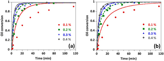 Figure 8 shows the experimental and kinetic modelling results corresponding to the effect of the initial catalyst concentration. As can be seen, the pseudo-homogeneous model overestimates the oil conversion, especially at low catalyst contents. Therefore, just considering the saponification reactions is not sufficient to obtain a good description of the reacting system evolution. The heterogeneous kinetic model, on the other hand, fits well the results obtained at catalyst concentrations above 0.1 wt.% NaOH; however, for the lowest catalyst concentration, the discrepancies remain important. Clearly, the model provides results as if the catalyst concentration was higher than expected. In this regard, one of our assumptions was to assign the same kinetic constant to all the saponification reactions in order to reduce the number of parameters. However, it seems that this simplification has to be reconsidered. In addition, catalyst deactivation can be also an issue, as previously noted [35].