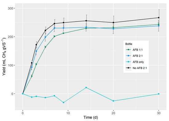Comparison of specific methane yields with/without the AFB technique. The yield over time is shown for CGP. Error bars show standard deviation (n = 3). Only one replicate was made for AFB only.