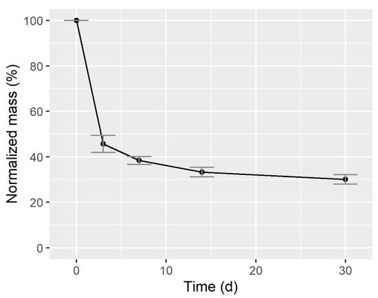 The strategy to consider mineralization was to obtain and quantify the mass loss as well as the N and S mass (%) in the feedstock before and after AD. It would therefore require the total mass loss by weighing the AFB before and after digestion and measuring the N and S concentration before and after digestion to obtain the overall mass balance. The mass loss over time is shown in Figure 2.