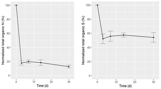 Total N and S mass of digested CGP in bags over time, normalized to the initial N and S mass. Error bars show standard deviation (n = 3).