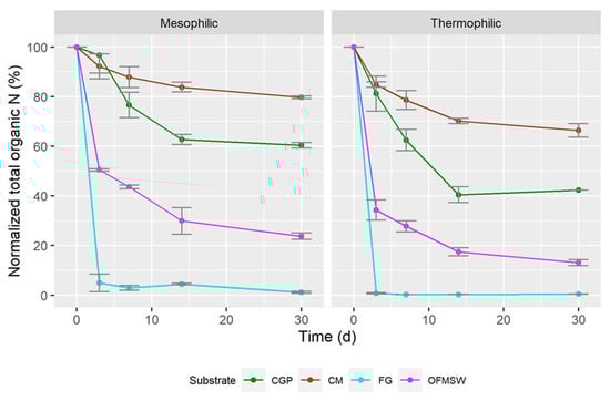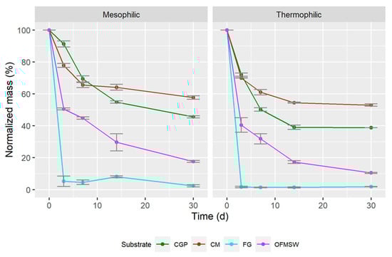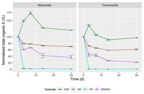 For the S mineralization, similar trends were observed with a higher fraction of release with thermophilic conditions; the results are shown in Figure 6. The rate of S mass reduction is high for all substrates from t = 0 to t = 3 d and decreases over time afterwards, except for CGP.