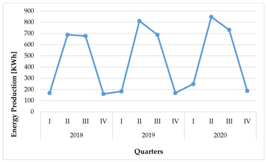 The research object was a 5.28 kWp PV installation, which is an exemplary implementation of the PROSUMENT program. The data come from the installation mounted on the roof of a private house in Ostrowiec Świętokrzyski (Świętokrzyskie Province) and includes the amount of energy produced (in kWh) in individual quarters in the last three years, i.e., 2018–2020. Figure 1 presents a graphical illustration of the quarterly production of electricity in the analyzed period.