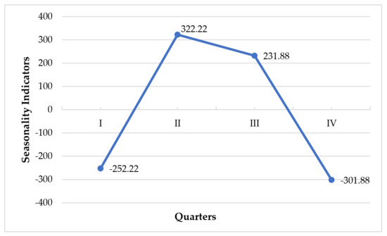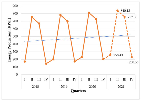 As demonstrated in Figure 2, due to the seasonality, the energy production of the studied household in 2018–2020 was on average lower by 252.22 KWh in each of the first quarters. On the other hand, it was higher by 322.22 KWh on average in each of the second quarters, and higher by 231.88 KWh on average in each of the third quarters. In each of the fourth quarters, it was lower by 301.88 KWh on average than the result of the trend function.