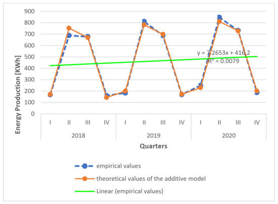 Quarterly PV energy production in a private house located in Ostrowiec Świetokrzyski in the years 2018–2020 (empirical series, analytically unified series, and the series of theoretical values of the additive model).