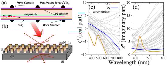 Diffused p+– and n+–doping profiles were measured and are used for the electro-optical modeling of the flat base structure allowing an improved, multiscale approach within a rapid and versatile numerical framework, scalable and variable with low computational effort based on the Rigorous Coupled Wave Analysis (RCWA) or Fourier Modal Method (FMM). Additionally, to real doping profiles, we focus on integrated electro-optical effects stemming from the free carrier absorption (FCA) in doped Si [] and present simulations of nanostructured PV devices achieving a highly realistic description of a highly efficient and low-cost photovoltaic device with the aim to improve the photocurrent further. A range of geometrical parameters is investigated in terms of the wavelength-independent short circuit current . Moreover, the focus is on comparing relative photocurrent gain using different material classes for the nanostructure. Figure 1c,d show the real and imaginary part of the permittivities, respectively, of a range of transition metal nitrides in comparison to gold as a commonly used plasmonic material.