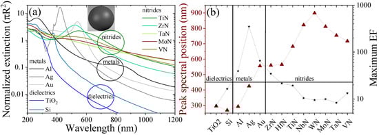 In a first step, we consider the optical properties of spherical nanoparticles using three different material classes. Figure 2a shows the Mie scattering and the maximum near-field enhancement at the particle surface at the resonance positions of the different materials is collected in Figure 2b. Metals continue to receive much attention for photonic applications because they show the strongest field enhancement factor (EF), note the logarithmic scale. In dye-sensitized solar cells or other systems relying on the field enhancement of added nanoparticles, metals remain a prime choice. On the other hand, the selected dielectrics and nitrides show a moderate field enhancement. There are few materials that are close to (TiN, HfN, Si, VN) or above (ZrN) the (arbitrary) line of separation at . Overall, nitrides show a similar or higher EF than the considered dielectrics. In addition, electrochemical growth of nitride nanopillars can lead to additional doping of the systems [,] and thus yield overall higher field enhancement factors comparable with metal systems.