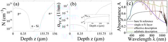 For each subdivision of the c-Si layer, the free carrier absorption is calculated and from this the modified permittivity of doped Si which results in capturing the absorption effects, see Figure 3b, beyond the usage of available data [] for undoped bulk material. These multilayered systems typically converge for ∼ subdivisions. The total width of this c-Si region is m and the additional doping profiles affect about m at the front and back of the structure, respectively.