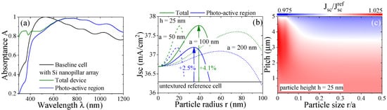 In Figure 4b, the wavelength-independent short circuit current is shown as a function of particle size, nanopillar height fixed at nm, and three particle separations. Here, the absorption of the whole device (green curves) and the absorption of only the photo-active Si wafer (blue curves) are considered separately thus excluding parasitic absorption effects in the particle layer itself. Since the baseline cell is already highly optimized, the nanoparticle layer adds only a few percent to the photocurrent gain. For the different geometries, distinct optimum particle sizes are found. Although all cases show an increase in the photocurrent, the calculation considering the total absorptance in the system overestimates the benefits of employing nanoparticles. Finally, Figure 4c shows the dependence on the nanopillar radius size and distance for a fixed height for the case of excluding parasitic absorption in the nanostructure. The relative change in the photocurrent can be both positive or negative. For the range shown, dielectric Si nanopillars mostly enhance the photocurrent, though excluding absorption in the particle layer rarely results in a relative photocurrent gain above . In particular, the region for large particle separations at low size-to-distance ratios shows strong enhancement of the photocurrent. This is the condition for Black Silicon structures [].
