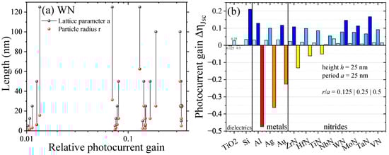 A similar analysis for nitride nanopillar arrays yields the results presented in Figure 5. For WN as a representative of this material class, Figure 5a shows the relative photocurrent gain for many combinations of nanopillar radius and distance (lattice parameter) yielding over 30% relative gain with respect to the untextured baseline cell in several cases. A competitive overview of results for is given in Figure 5b for three geometric sets of nanopillar layers with varying -ratio. To each material , , and are shown side-by-side. The colors are meant as a guide to the eye: yellow for moderate, orange or red for high losses often due to parasitic material absorption in the nanostructure itself. The different shades of blue indicate positive photocurrent gain from minor (light blue) to moderate (dim blue) to large (bright blue) gains. Metals show strong losses for the case of touching nanopillars (). The same is true for those nitrides whose plasmonic resonance is most comparable to gold, i.e., ZrN and HfN and, thus, have an overlap with the optimized spectral region of the baseline solar cell. In these cases, the absorption in the nanoparticle layer strongly hinders the absorption within the baseline cell. Overall, this case is connected to the shading effect. If too much additional material is placed on top of the solar cell device, the incident light will be either reflected or absorbed in the particle layer itself, which strongly reduces the photocurrent yield.