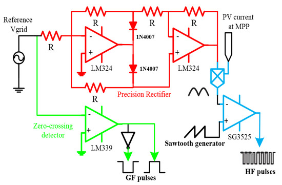 The proposed analog control circuit is shown in Figure 2. This circuit consists of three parts, a precision rectifier circuit, pulse width modulation (PWM) comparator, and zero-crossing detector. As observed, the precision rectifier circuit is implemented using the operational amplifier type LM324 in order to generate the rectified sine wave from the grid voltage. This signal is regulated by the MPPT algorithm to produce the reference signal of the primary current which is compared with the high switching frequency signal.