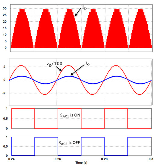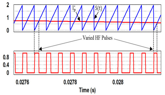 Figure 6 presents the reference signal of the primary current with the high-frequency S(t) signal, and the produced HF pulses (SPWM pulses) that control the main MOSFET. As observed in Figure 7, the proposed control scheme has an identical accuracy in the tracking of the reference signal. Figure 8 reports the primary current of the flyback inverter, whose shape represents a rectified sine wave with a peak value of .