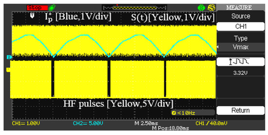 Experimental waveforms of the switching control signals. Top to bottom: primary current reference signal with S(t) signal, and HF pulses of .