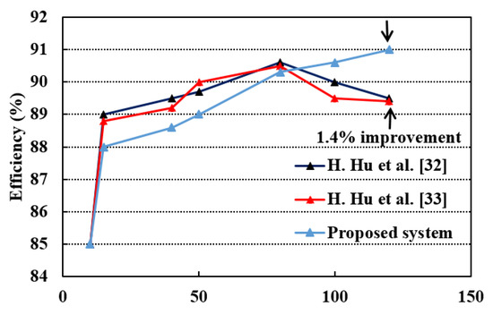 Furthermore, we used an ATMega 328 microcontroller embedded in Arduino Uno board for the implementation of the control scheme instead of complex expensive controllers, which makes the cost of the implementation system low. As observed, the proposed control scheme is simpler and less expensive compared to the others. In addition, the maximum system efficiency obtained in this work was 91% which is rather comparable to existing works. Moreover, the proposed system efficiency is compared with that obtained by the single-stage flyback systems [32,33] as presented in Figure 13. From this figure, it is clear that the proposed system has a good efficiency, especially at a high output power.