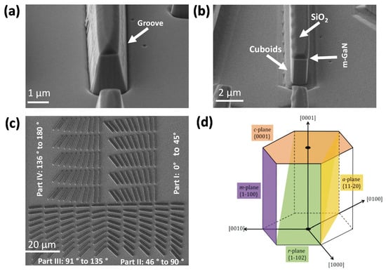 SEM images of fingers after GaN etching;(a) bird eye view of finger after dry etching; (b) bird eye view of finger after wet etching with TMAH solution; (c) top view of an ensemble of fingers for orientation between 0° and 180°; (d) GaN crystallographic planes [].