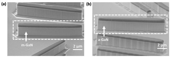 It can be easily observed from Figure 3a that the m-GaN plane surrounded by the dashed rectangle has relatively much lower roughness on its surface compared to the a-GaN plane, which is presented in Figure 3b surrounded by the dashed rectangle. After 10 min of wet etching, the a-GaN plane sidewalls are completely vertical, no further smoothening occurs after that. The relatively higher etching rate of the a-GaN plane results from its lower etching resistivity. On the other hand, a 25 min wet etching process is needed to achieve vertical m-GaN fingers, owing to its higher etching resistivity []. In light of this, m-GaN orientated Fins is the best choice for the fabrication of high performance vertical FinFET GaN transistor. Noteworthy is the fact that the etching rate of GaN is not solely determined by TMAH solution parameters; rather, it is determined by a variety of factors, such as the mask selection [], the doping level [] and the crystalline quality resulting from GaN epitaxial growth conditions [].