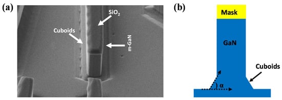 Another explanation has been reported by Fatahilah, M.F. et al. []. According to their observation, the slope is created due to TMAH hydrodynamics flow during the GaN chemical etching. To validate this assumption, we have used two GaN on sapphire substrate samples with dry-etched GaN fingers fabricated using the same process as in Figure 1. Indeed, using the TMAH etching recipe described above, both samples are etched for 25 min, one with agitation and the other without. The TMAH hydrodynamics flow is different for these two samples. After etching, the slopes α observed at the bottom of the fingers are identical on both samples. Furthermore, the Cuboids slope is not depending on the distance between the two neighbor fingers. Thus, the origin of the Cuboids created at the Fins GaN sidewall base after TMAH etching is still not elucidated and needs to be more investigated.
