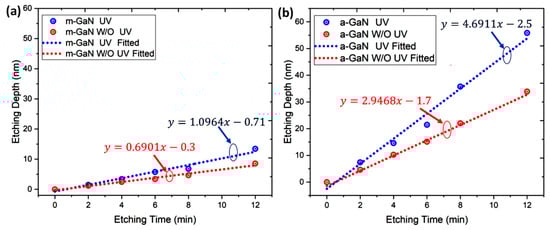 It is observable from Figure 5 that the m-GaN etching rate is enhanced from 0.69 to 1.1 nm/min by using UV light. Moreover, in the case of a-GaN etching rate, UV light enhances the etching rate from 2.95 to 4.69 nm/min.