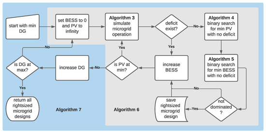 This flowchart illustrates the rightsizing procedure, with DG denoting diesel generator power and PV denoting photovoltaic power. The energy management system (Algorithm 1) is run exclusively as a subroutine of single time step simulation (Algorithm 2), which is run exclusively as a subroutine of the microgrid simulation (Algorithm 3). Microgrid simulation (Algorithm 3) is run as a subroutine within the binary search for the minimum photovoltaic power (Algorithm 4), within the binary search for the minimum BESS energy (Algorithm 5), and within the rightsizing search for a given level of diesel generation (Algorithm 6).