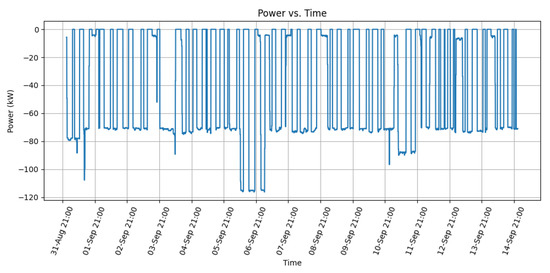In the simulation results presented in this section, we focus on an anonymized version of a load profile obtained from an actual facility to which we applied our rightsizing methods. Our aim was to identify microgrid designs capable of fully sustaining loads, while operating exclusively in islanding mode. The time horizon considerd is 14 days, discretized in time steps of 4 minutes in duration. The power load profile is shown in Figure 3, and follows our convention of negative power values representing loads and BESS charging, to differentiate from positive-valued power generation and BESS discharging.