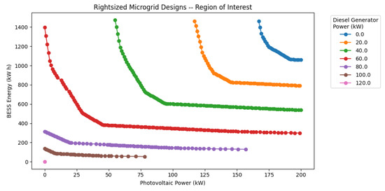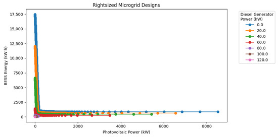 For any diesel generation power rating , we can observe inflection points, to the left of which BESS capacity increases rapidly and to the right of which photovoltaic power increases rapidly. Microgrid designs with a high utilization of both their photovoltaic system and BESS will be close to these inflection points.