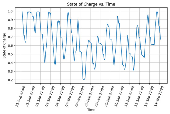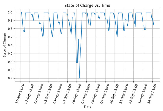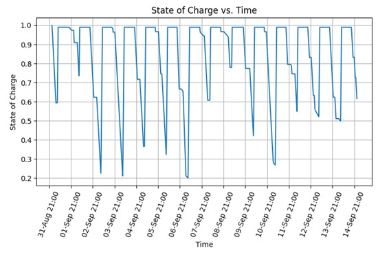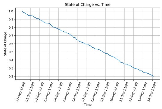 Without power generation capacity, the state of charge continuously decreases until its minimum allowable value of 20% is reached at the end of the time horizon, as shown in Figure 6.