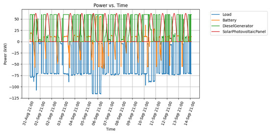 A microgrid with 60 kW diesel generation , 81 kW of photovoltaic power and 360 kW·h BESS energy rating is rightsized. The power profile is shown in Figure 14.