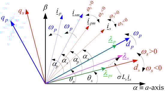 where up and us are the primary and secondary winding voltages respectively, while λp and λs are the corresponding fluxes. The remaining parameters are as follows: the primary and secondary winding resistances Rp and Rs, and self-inductances Lp and Ls, Lps is the primary to secondary mutual (magnetizing) inductance, σ = 1–L2ps/(LpLs) is the leakage factor, λps is the mutual flux linkage, and “*” denotes a complex conjugate as usual. All the vectors in the primary voltage and flux equations are stationary in a dq reference frame rotating at ωp, and so are secondary counterparts but in a ωs rotating dq reference frame shown in the phasor diagram of Figure 2. Note that ism = is and ipm =ip (in their respective frames) are the magnetically coupled currents from one machine side to the other, with the same magnitude albeit a different frequency to the originating current vectors as a result of the frequency modulating action of the rotor [7,37].