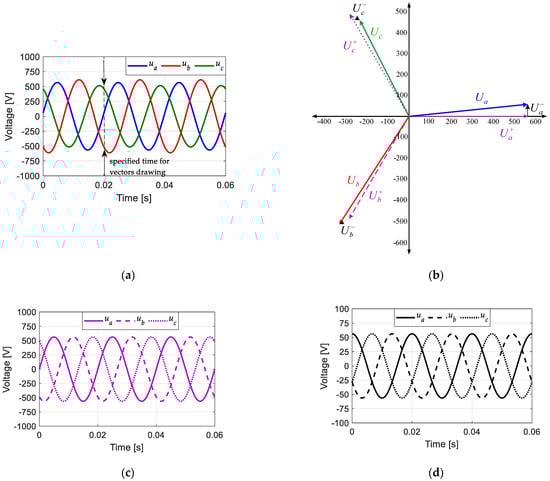 (a) Three-phase unbalanced voltages instantaneous values with 10% Voltage Unbalance Factor (VUF), (b) three-phase vector diagram of the distorted waveform, (c) positive sequence, and (d) negative sequence. Negative sequence voltage magnitudes are 10% of positive counterparts at the same frequency.
