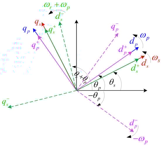 where F+s and F−s are the positive and negative sequence components in the respective positive and negative reference frames rotating at (ωr − ωp) and (ωr + ωp), respectively. The reference frames of the BDFRG unbalanced model are illustrated in Figure 4.