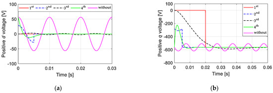 Unbalanced voltages in the positive dq reference frame with and without using the separation methods (a) positive d component; (b) positive q component.