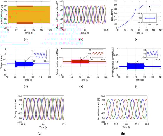 Simulated results with conventional control under transient primary voltage unbalance of 10% VUF during 80–100 s, with a constant rotor speed at 600 rpm; (a) primary voltage profile; (b) transient transaction period between normal and unbalanced conditions; (c) speed curve of the BDFRG; (d) electromagnetic torque; (e) primary active power; (f) primary reactive power; (g) transient period between normal and unbalanced conditions for the primary current; (h) transient period for the secondary current.
